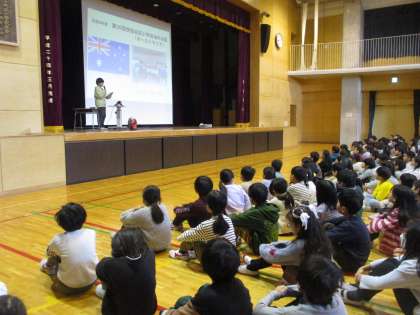 体育館で行われた全校朝会は、6年生代表3名のあいさつの後、今年度の世田谷区教育事業である海外派遣にオーストラリアへ代表で行った5年生の報告会でした。