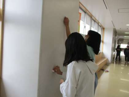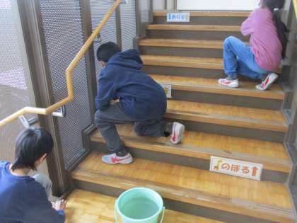 総合的な学習の時間で、校舎をきれいにすることになったそうで、普段の掃除では行き届かない階段や柱などを熱心に拭き、汚れを落としてくれていました。