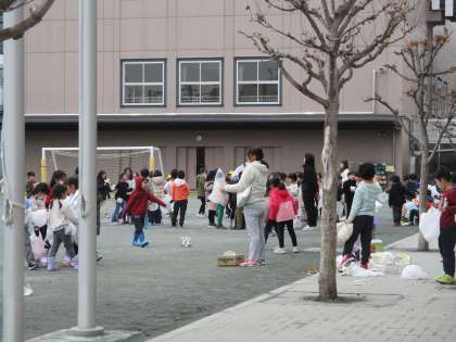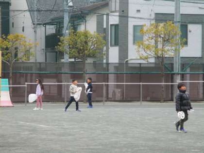 1時間目に校庭で、家から持ってきた袋や、用意した材料で作った風を受けて動くおもちゃを使い、楽しく活動していた1年生。