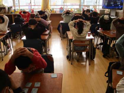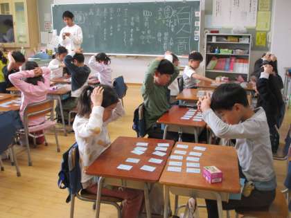 手を頭の上に乗せ、友達と机を向かい合わせにして2人組になり、熱心に百人一首のかるた取りを行っていました。