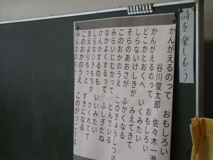 5年生の教室では「国語」の授業を行っていました。「かんがえるのっておもしろい」という詩から子どもたちがいろいろなことを感じ、交流する学習でした。