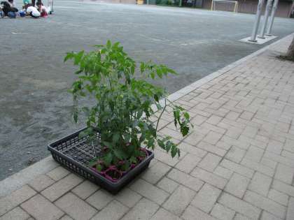 生活科の学習で、一人一つずつミニトマトの苗を鉢に植えました。
