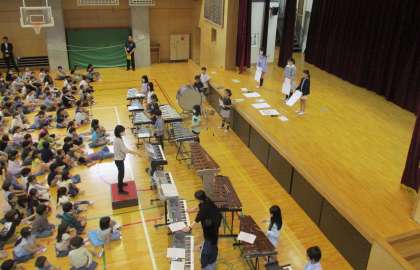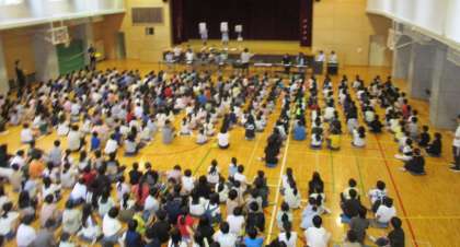 朝時間に全校が体育館に集まって、音楽集会を行いました。