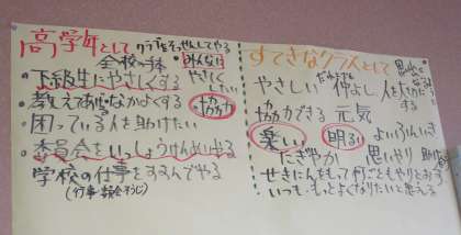 教室をのぞくと、理科の実験であったり、高学年として頑張りたいことであったり、普段の日常が見えました。移動教室であっても、教室であっても頑張ることはいつも同じだということですね。