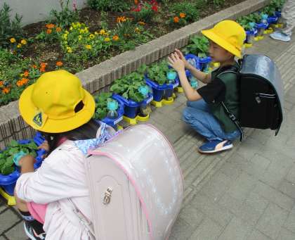 校門を入ってすぐのところで、1年生が一人一鉢で朝顔を育てています。