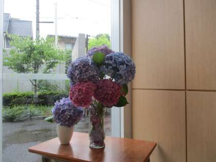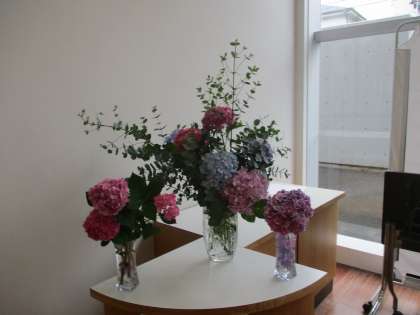地域の方から立派なユーカリをいただきました。いただいたものを生けようと、校庭の紫陽花もいっしょに生けることにしました。