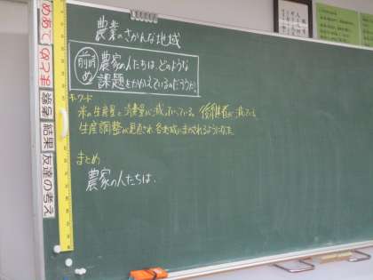 「以前に比べて、お米を食べる量が減ってきたから、お米の生産量が減ってきている。」「後継者不足」「生産調整をしなければならない。」などの農家さんが抱える課題について先週までに学習していました。今回は、その課題をどのように解決していくのかを考える学習です。農家さんの思いを予想し、どのような取り組みが考えられるかを発表し合い、資料から読み取っていくという流れでした。