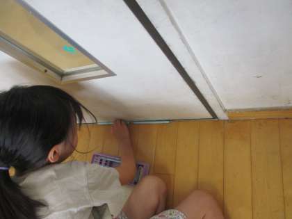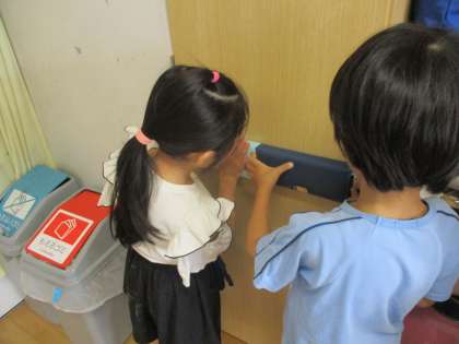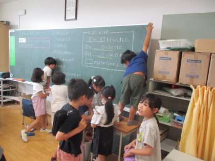 「教室のドアの横の長さと、黒板の縦の長さはどちらが長いだろう。」という課題を、「鉛筆で何本分なのかはかればいいよ。」「手を広げて何人分なのかはかればいいよ。」など、いろいろなはかり方をしていました。