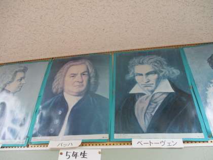 第一音楽室では、偉大な音楽家に見守られながら「とんび」という曲の旋律の特徴を見つける学習をしていました。