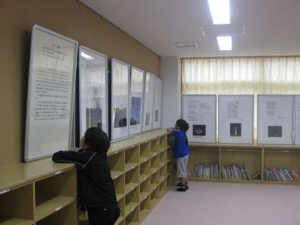 土曜日の国際理解集会のお客様がイギリスの方ということにちなんで、世田谷文学館よりお借りしたパネルが51枚展示されています。おなじみのクマのプーさんですが、原作者A.A.ミルンはイギリス人で、お話の舞台もイギリスです。「クマのプーさん」「プー横丁にたった家」など、クマのプーさんの関連の本が写真や絵本になって紹介している本の全ページが大きなパネルとなって、展示されています。学校公開の時、えほんのへやと図書室に立ちよってみてください。