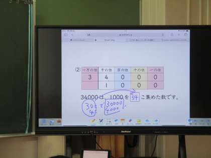 子どもが直接、電子黒板に書き込んだり、教科書のQRコードをタブレット端末で読み取って、課題にチャレンジするなど様々なICT機器を駆使して授業を展開しています。