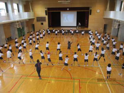 腰をしっかり落として周りのお手本となる子、掛け声で回りを引っ張る子、隊形移動で目印になるよう場所を覚える子。一人一人がいろいろなめあてをもち、達成のために一生懸命、練習に取り組んでいます。先生方も、子どもたちがめあてを練習の度にアップデートしていけるよう声をかけています。