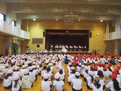 本日雨天のため、体育館で閉会式と応援合戦の練習をしました。