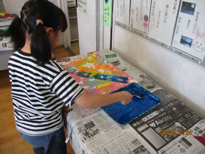 子どもたちは、思い思いの型を切り取り、いろいろな色で台紙にはんがを重ねていました。友達と作品の感想を伝えあったり、アイディアを交換したりしていました。