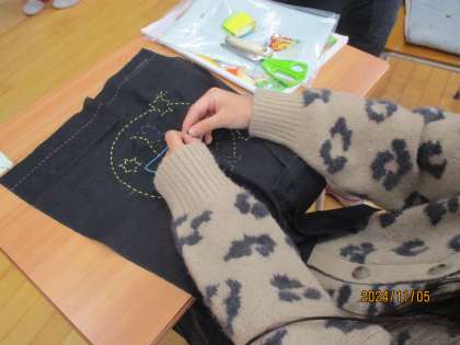 思い思いの柄に刺繡を頑張っていました。糸の色を変えたり、二重三重に縫ったり一生懸命取り組んでいました。保護者ボランティアの方の支えもありました。ありがとうございました。展覧会で展示する予定です。お楽しみに。