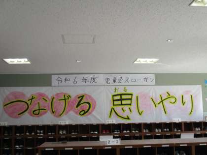 以前にもお伝えしましたが、児童会がスローガンをたてました。そのスローガンを昇降口に貼ってあります。また、国際理解推進の掲示がいちょうホールにあります。
