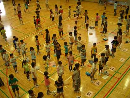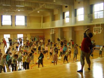 朝6時30分から、体育館で子どもたち、保護者の方一緒に体操をしています。早寝早起きを心がけ、暑い夏を元気に過ごしてください。