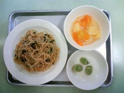 ・塩やきそば ・牛乳 ・ゆでそら豆 ・フルーツカクテル でした。