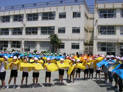 5月14日(木)さわやかな好天に恵まれて、70周年記念の航空写真撮影を実施いたしました。全校児童と教職員で校庭に人文字を作りました。デザインは、6年児童が作ったものです。子どもたちは、色のエプロンをつけて校庭に並びました。しばらくすると、飛行機が飛んできて、空から撮影してくれました。何枚か撮り、撮影が終わると、校庭の上空を羽を揺らしながら帰っていきました。どんな写真ができるか楽しみです。