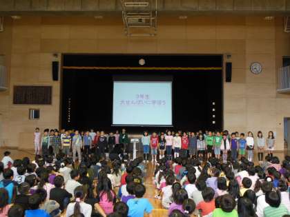 3年生が全校に伝えたのは「大先輩で学ぼうで学んだこと」です。