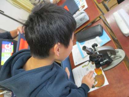 理科の「ものの溶け方」の学習です。今から、食塩を水に溶かす学習を行います。その前に、食塩を顕微鏡で覗いてみようと、顕微鏡の扱い方を学び、食塩の結晶の形を見ていました。「見えた!」「倍率をあげてみよう。」などの声が上がり、楽しそうに学習を進めていました。