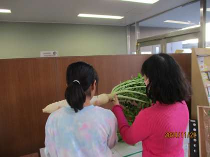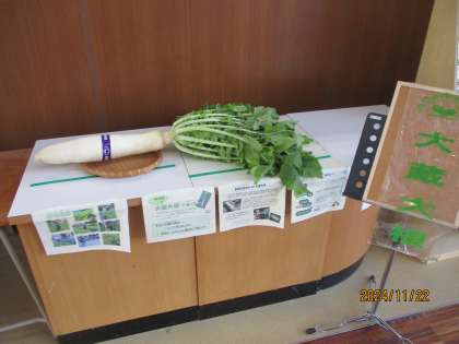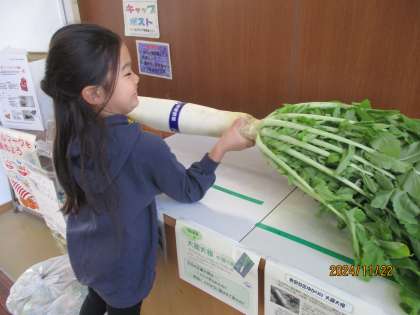 せたがやそだちの大蔵大根をいちょうホールに置いて、子どもたちに紹介しました。「うわぁ。大きい。」、「重い。」、「この1本で何クラス分くらいになるんだろう。」と子どもたちは驚いていました。