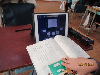 国語の学習では、物語文を読んで、面白いと感じたところをメモして、それをクラス全体で共有し、考えの幅を広げていました。こういった学習ではICT機器が活躍します。ノートを書く時、ICT機器を使う時など、用途によって使い分けが判断できるように指導してします。