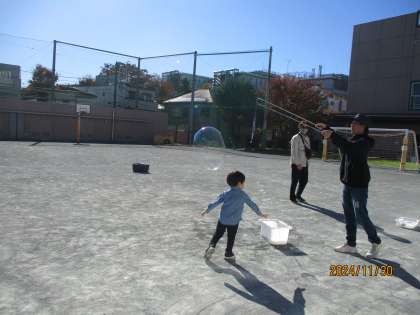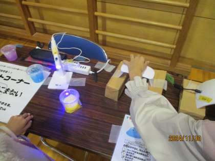 「巨大シャボン玉を作ろう」、「光るスライムを作ろう」、「フラワーアレンジメントをしよう」などと、ここには紹介しきれないほどたくさんのお店が出ています。列に並ぶ安全管理や放送は、本校のボランティア児童が行っています。