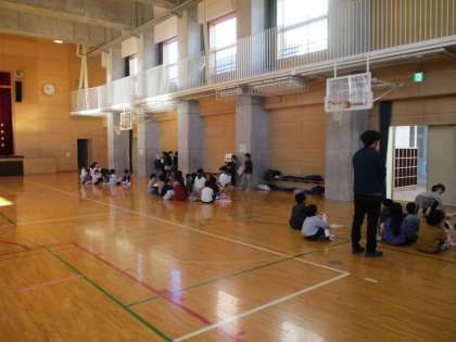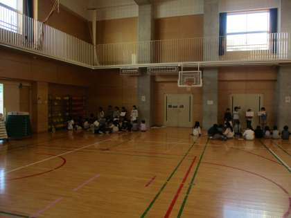 2年生が、生活科の学習で町探検に行ってきました。そこで聞いたり見てきたりしたことをまとめました。その成果を1年生に向けて発表をするという学習です。体育館でグループに分かれて行いました。