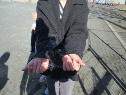 校庭には霜が降りた形跡があり、ぬかるみがありました。砂場を覆うシートには水たまりがあり、凍っていました。他にも木々の葉が落ちていることや、カマキリの卵などいろいろなものを見つけて写真を撮る子供たちの姿がありました。四季を感じられる日本ならではの学習です。