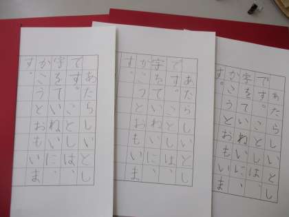 一年の初めに、字の上達を祈願する意味が込められいること。紙に抱負や目標をしたためること。地方によっては1月2日の朝露を集めて墨を擦って書き初めをすることなど、書き初めについて子どもたちに伝えていました。1年生は真剣に話を聞き、一生懸命、字を書いていました。