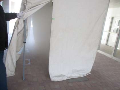 そして、地震から発生する家事を想定し、2年生と5年生は「煙ハウス体験」を行いました。子どもたちは、「思っていたよりも見えない。」と話し、視界が悪い時には、壁を伝って移動する、姿勢を低く保つなどを体験的に学びました。