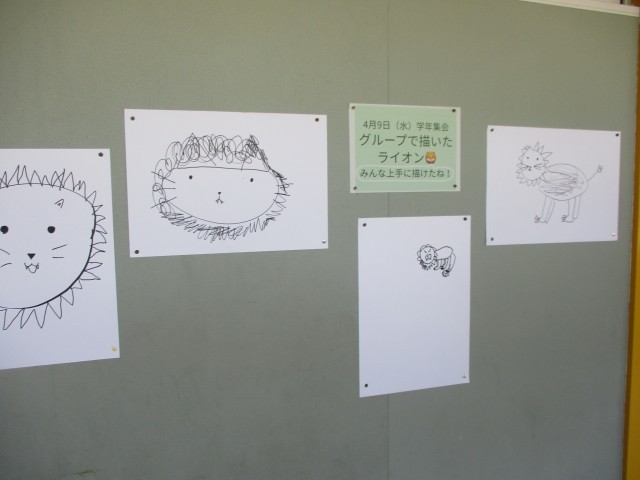 廊下へ出ると、新しく着た先生が、「ほかの先生や学年はどんな授業をしているのかな」と他のクラスの授業をのぞいていました。また、4年生の教室の掲示板にはなにやらライオンが飾ってあります。「学年集会で、一人一画ずつ描いたのです。」と担任の先生が教えてくれました。