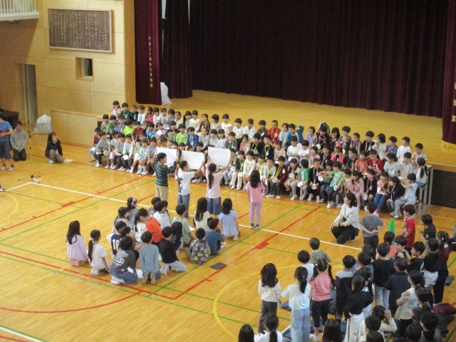 代表委員会が司会を務め、各学年から1年生を歓迎する歌やクイズを考えて発表しました。