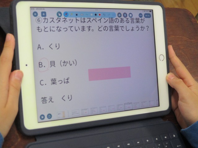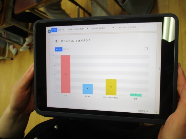 5年生の授業の初めに、先生が「楽器クイズ」や「アンケート」を取っていました。子どもたちが音楽を楽しみにできるよう、興味を引く授業の導入、クラスの実態を知るためのアンケートです。