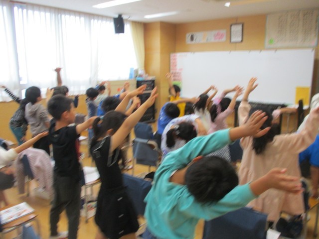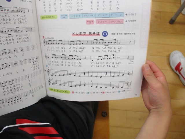 2年生の授業では、音に合わせた体操を取り入れ、その後、音階で歌を歌っていました。