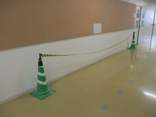 図工室の廊下側の壁の塗装がはがれ、中の板がむき出しになっていました。そこを、まず下塗りをして補修し、その後、ペンキできれいに仕上げてくれました。