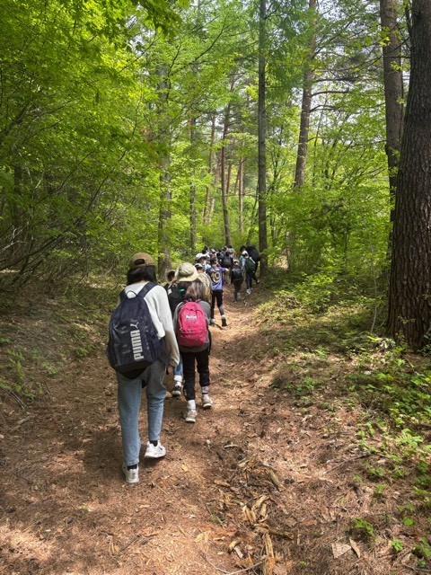 途中、丸太で道を塞がれている所もありましたが、何とか1時間遅れで宿に戻ってきました。お昼のおにぎりを美味しそうに頬張っていました。