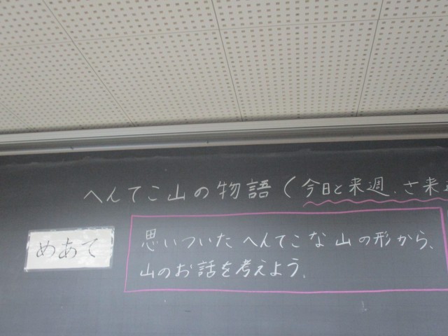 「かくかく山の物語を考えよう。色々なものがかくかくしているから、痛そうだからちくちく山にもなるなぁ。」「わたしはUFO山にしてみよう。宇宙に池があったら面白いかも。」などと、友達と見せ合いながら、楽しそうに子どもたちは想像力を膨らませていました。