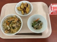 今日のこんだてちゃんこうどんツナとポテトの包み揚げ野菜のごま風味牛乳