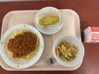 今日のこんだてスパゲッティミートソースチーズ入りイタリアンサラダスィートポテト牛...