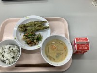 今日のこんだてわかめごはんししゃもの磯部揚げちくわと野菜のごまあえ豆乳入りみそ汁...