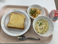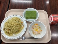 今日のこんだてキャベツとツナのスパゲッティ大根とコーンのサラダグリーンケーキ牛乳