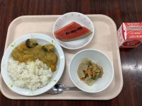 今日のこんだて夏野菜カレーライスこんにゃくサラダくだもの(すいか)牛乳