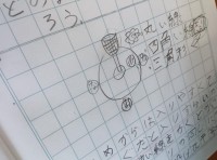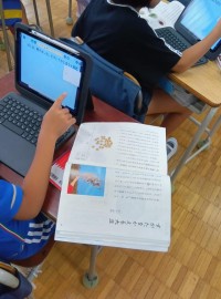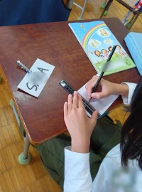 3年生の外国語活動です。名前をアルファベットで書いていました。名札はあるし、何を...