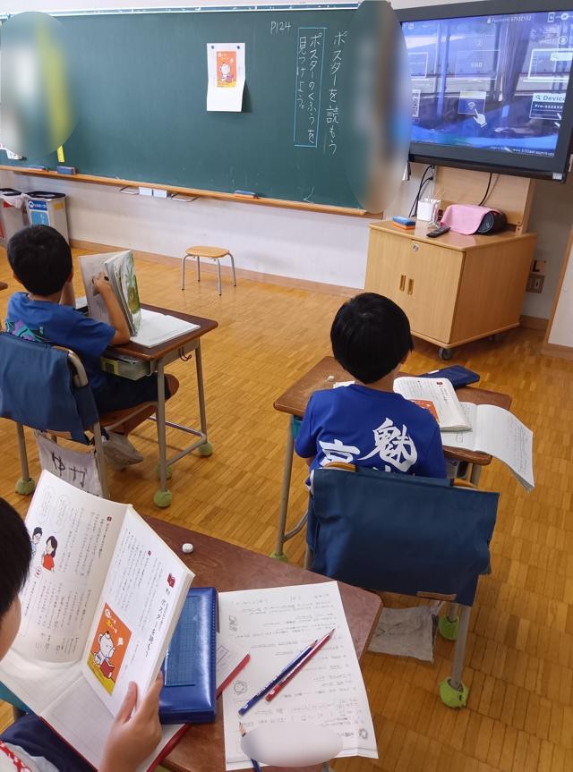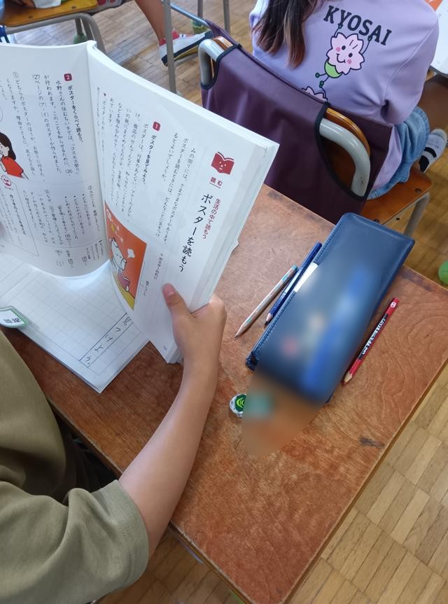 3年生の国語「ポスターを読もう」の学習です。まずは例示されているポスターを見て、ポスターとはどんなものかを見て、工夫を探していきます。