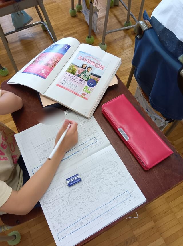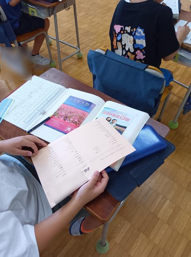 そのポスターの良さを表現するときに、言葉を選ぶために、子どもたちがさっと取り出していたカードがありました。名前を忘れたんですが、1年生から習ってきた「物や事がらの様子を表す言葉」が一覧になっています。自分の思いにピッタリくる言葉を探して、表現していました。語彙を増やすことは表現を増やすことにつながります。学習の中や日常の生活の中でも自分の表したいことにピッタリくる言葉を常に追究していく子どもたちであってほしいと思います。