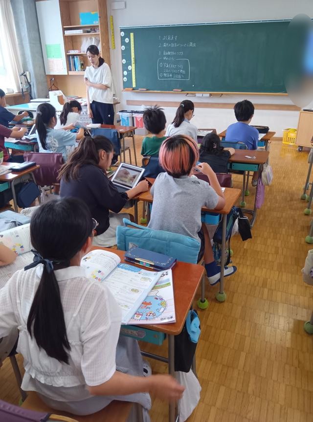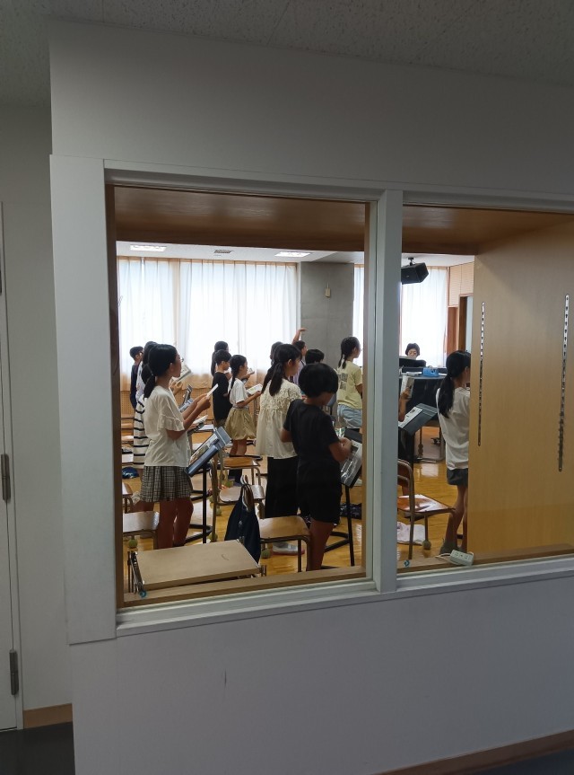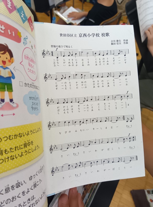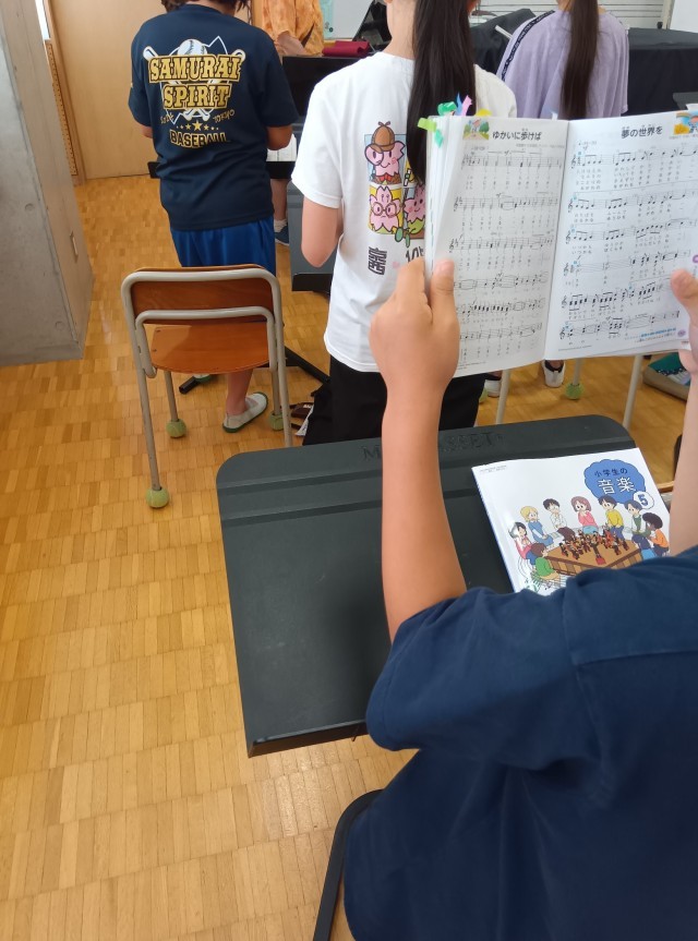 音楽をやっている学級をのぞくと、「校歌」の練習をしていました。歌集の初めのページに貼り付けた校歌のページを開いて、歌っています。明後日の終業式に向けての練習だそうです。全校で元気に歌って1学期を締めくくりたいと思います。