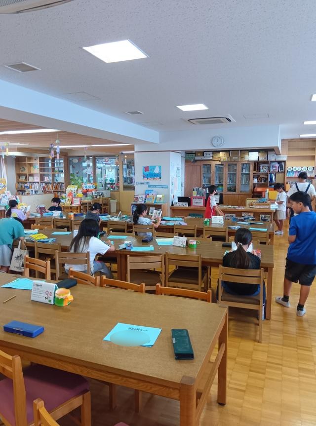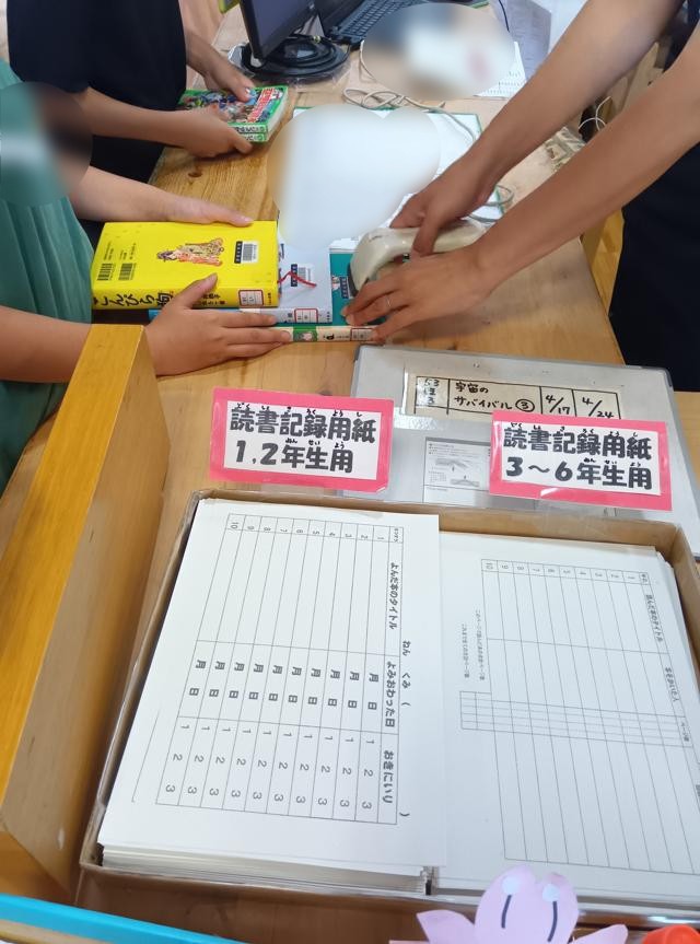 各学級、夏休みの図書の貸出を行っています。通常の図書で、読み聞かせや本の返却の後、本を探して借りていました。夏休み前は、3冊本を借りることができます。