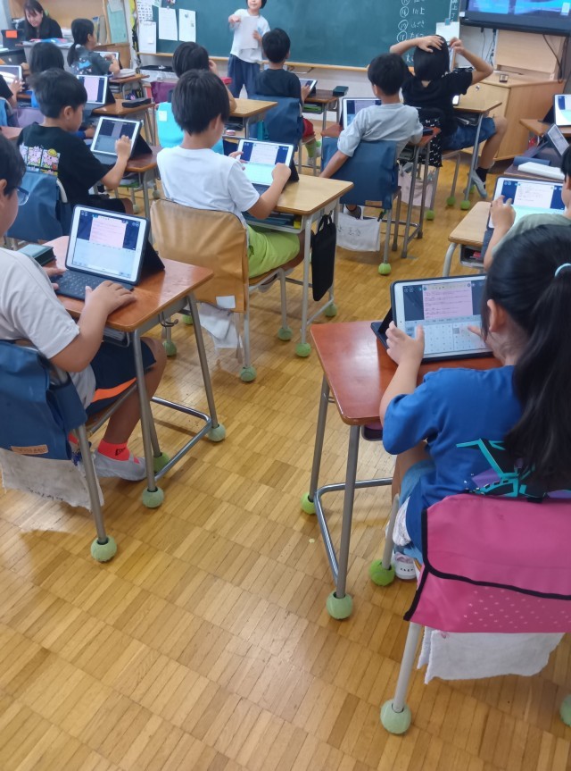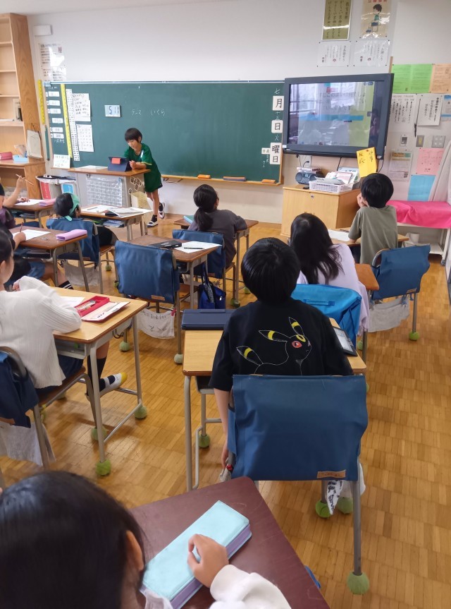 さて、4年生の教室では、総合的な学習の時間の発表が行われていました。「食べ物」について調べてまとめていた4年生、それぞれ調べたことを発表します。本、模造紙、タブレット端末・・・まとめ方も様々だったので、発表の仕方もそれぞれでした。ある子は「いくら」について調べていました。発表では、ちょうどいくらクイズをやっていました。